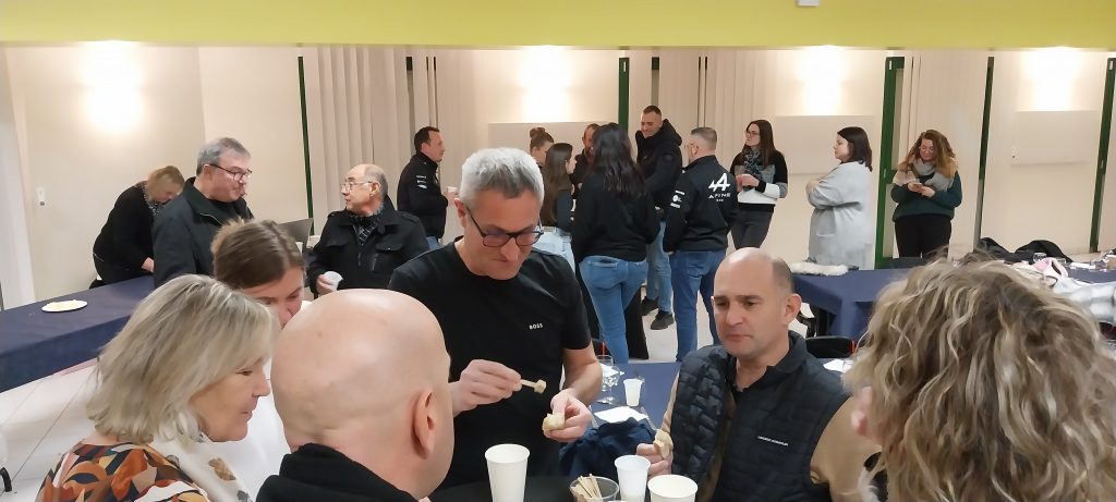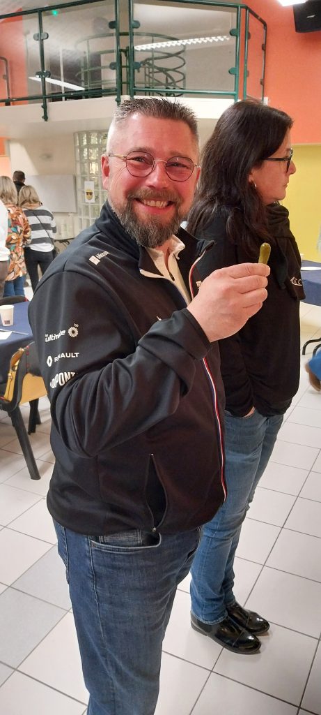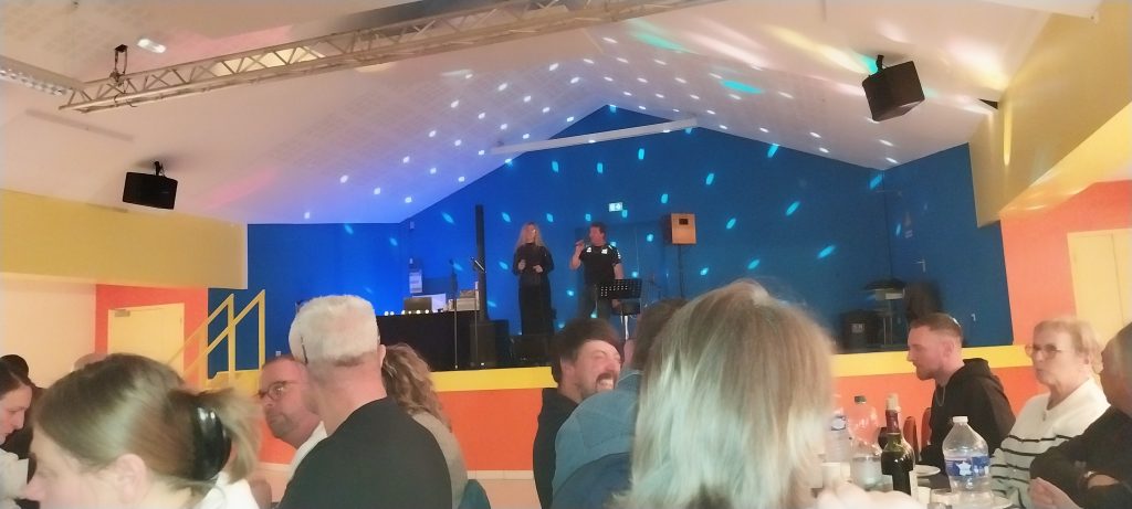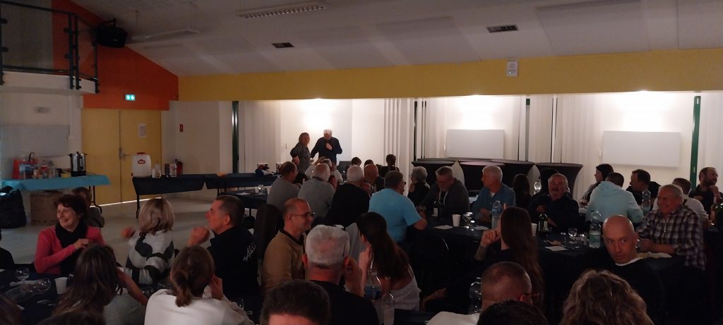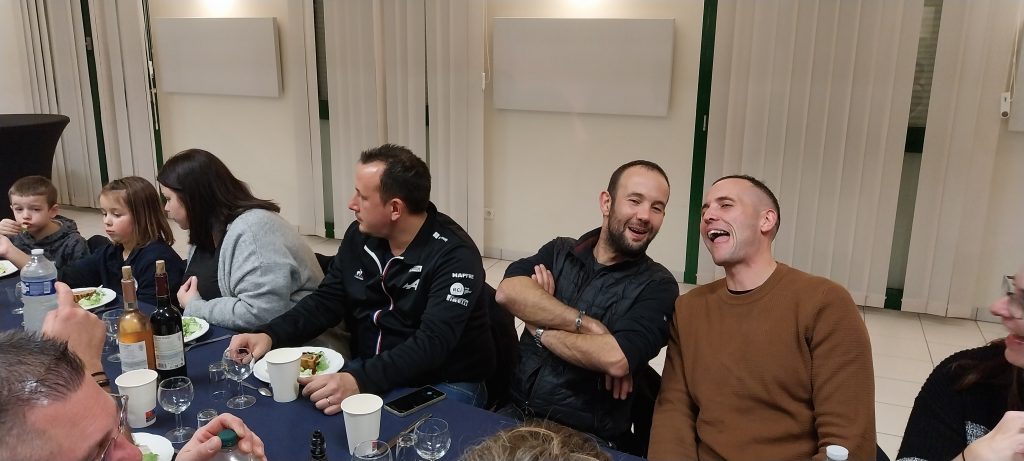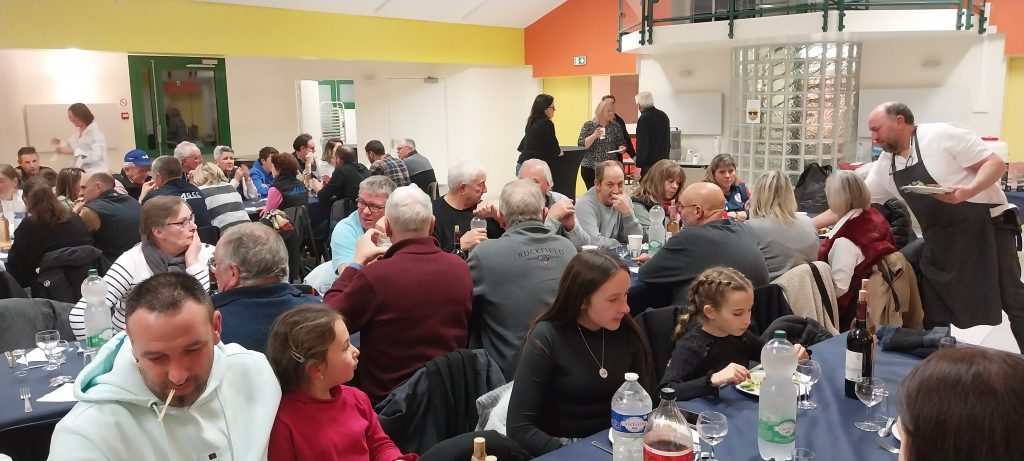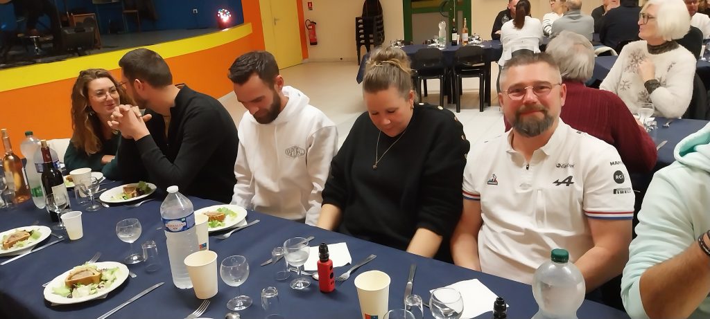 Cette mise en bouche faite, histoire d’attendre l’arrivée des retardataires, nous avons pu passer à une autre partie importante de la soirée, le repas. Gourmets et gourmands de tous âges avons pu nous délecter d’un plat idéal en cette saison, un bonne tartiflette tout en découvrant l’organe exceptionnel de notre ami Bruno qui nous a fait découvrir ses talent de crooner à la française et enflammé le dancefloor. Quel talent !